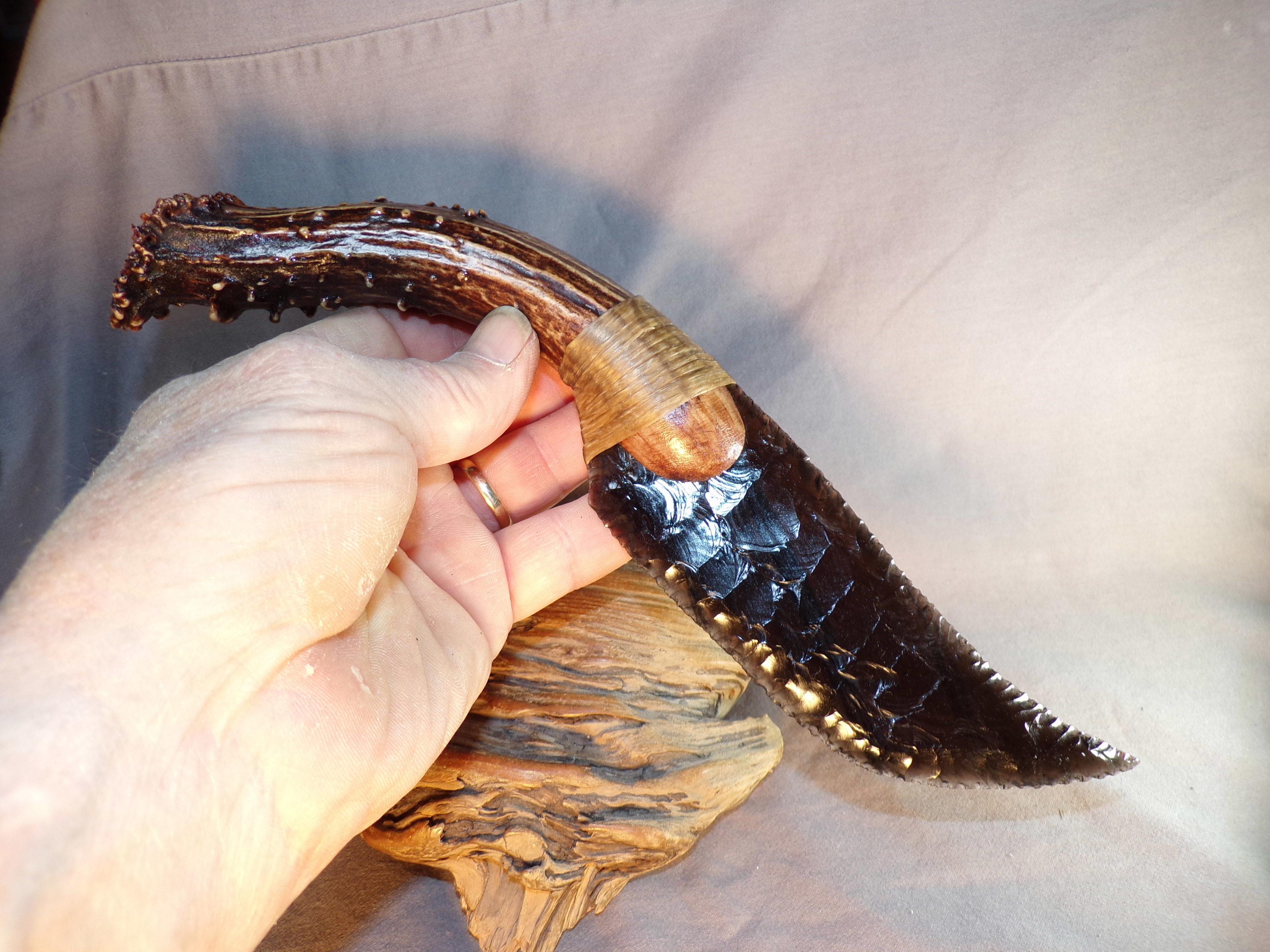 this very nice skinning blade has been knapped out of a clear black obsidian with some wispy ribbon lines. This handle is a nice black tail deer antler. This is a great knife