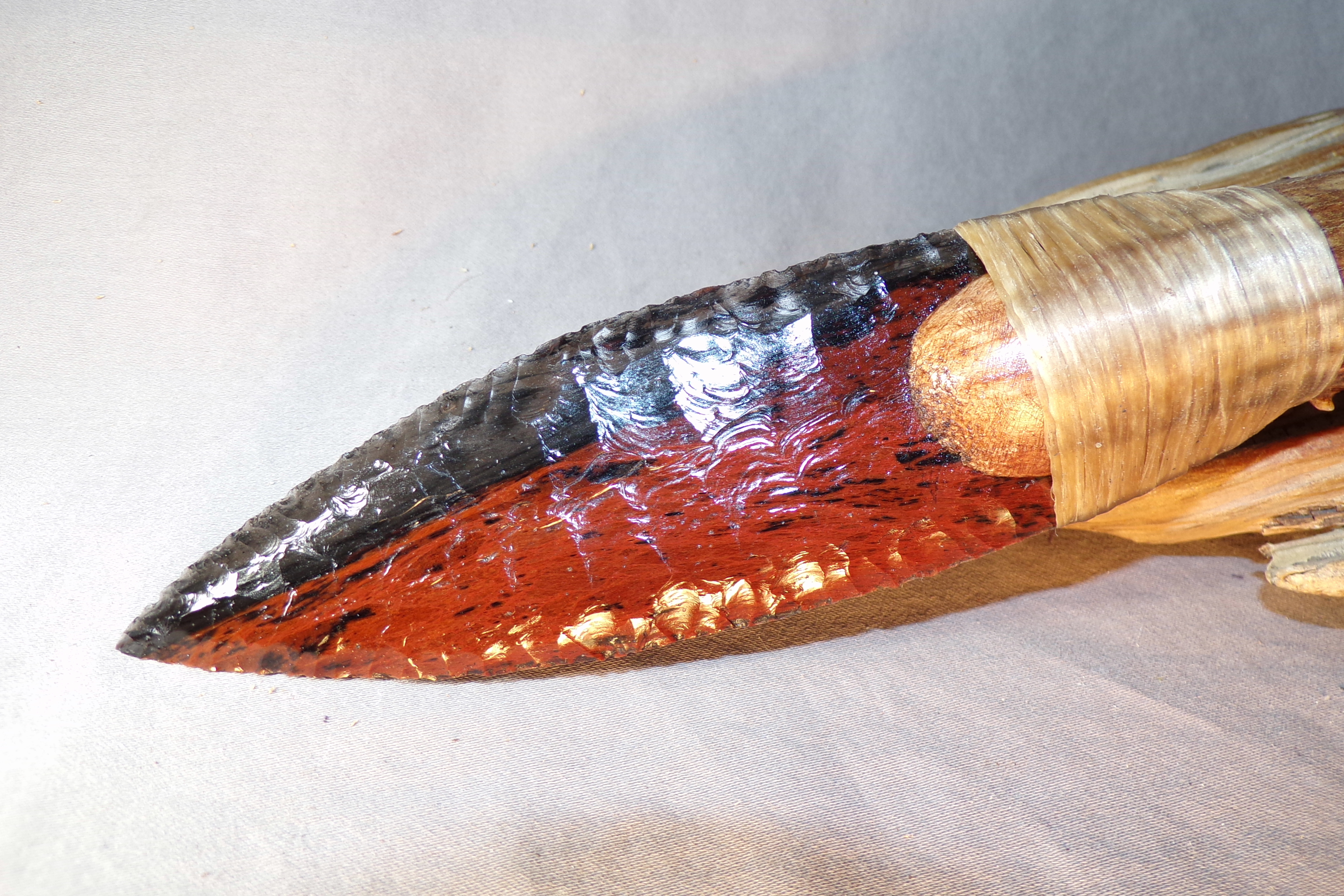 This beautiful and very nice knife is 10 3/4 inches long and this blade knapped out of a unique ribbon obsidian. This handle is a nice black tail deer antler. This is such a nice knife