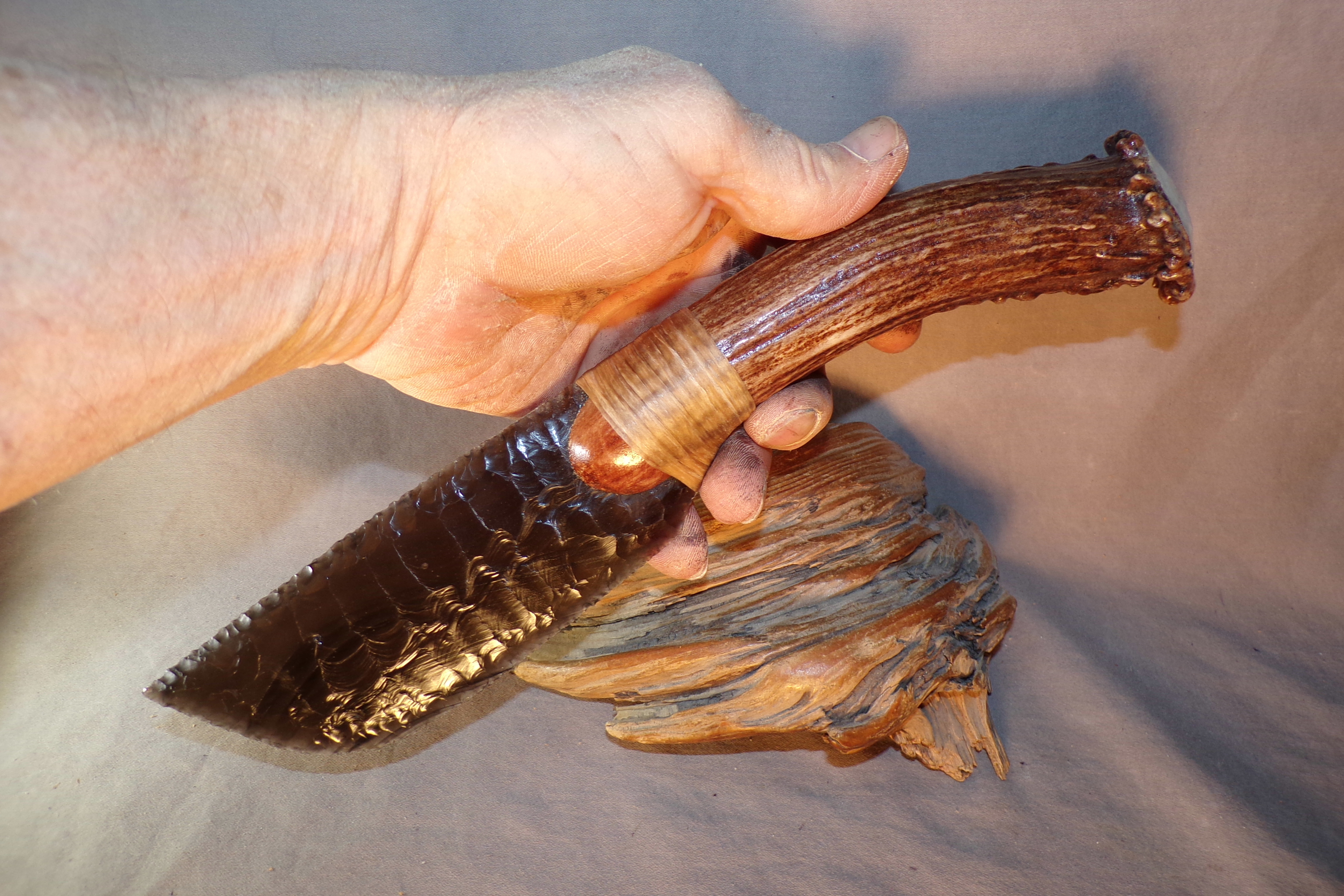This beautiful knife is 11 inches long and this cody blade has been knapped out of a subtle ribbon obsidian. This handle is a black tail deer antler.